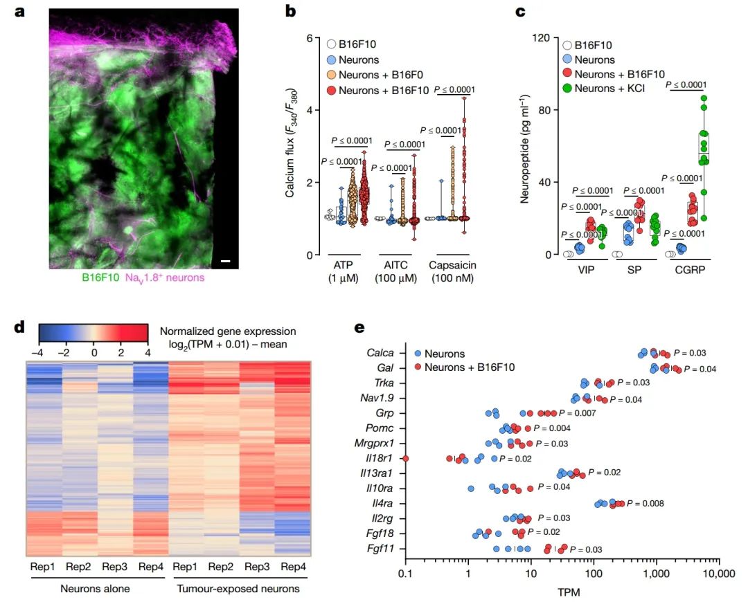 n如下:a:n = 4;b:神经元(来自10只小鼠的29个神经元)、B16F10(来自10个培养皿的16个细胞)、神经元 + B16F0(来自12只小鼠的387个神经元)、神经元 + B16F10(来自12只小鼠的409个神经元);c:神经元(n = 12)、神经元 + B16F10(n = 12)、神经元 + KCl(n = 12)、B16F10(n = 3);d、e:每组n = 4。