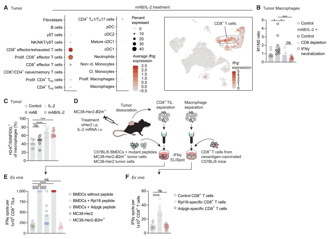 文章展示了长效mRNA编码的IL-2治疗能够恢复TME中的免疫细胞浸润、促进IFNγ驱动的高度炎症反应,并且当与针对肿瘤的单克隆抗体联合使用时,能够克服治疗抵抗。意外的发现是,这种治疗的有效性由能够识别由TME内活化的巨噬细胞跨呈递的新抗原的IFNγ释放CD8+ T细胞驱动。这些巨噬细胞在IL-2治疗下获得了增强的抗原呈递能力和其他M1表型相关的特征。