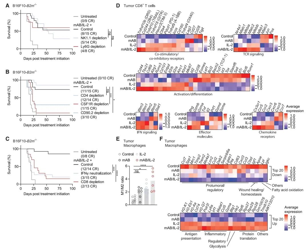 图5:CD8+ T细胞和巨噬细胞在mAB/IL-2处理的小鼠中排斥MHC I类缺失肿瘤中发挥核心作用