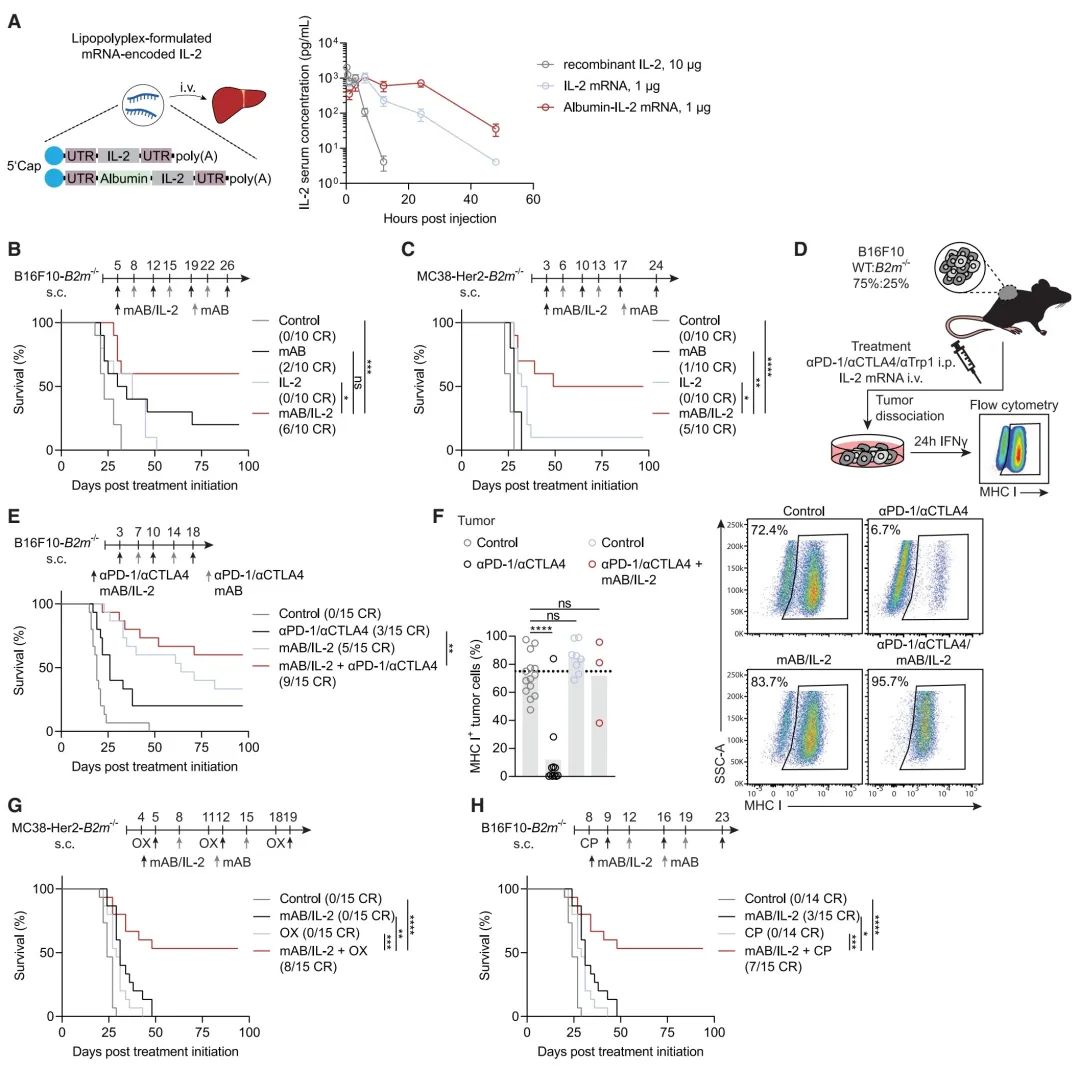 (G 和 H) 经αHer2单克隆抗体/IL-2、奥沙利铂(OX)或三联组合(G;n = 15)治疗的MC38-Her2-B2m-/-肿瘤小鼠的生存情况,或经αTrp1单克隆抗体/IL-2、环磷酰胺(CP)或三联组合(H;n = 14–15)治疗的B16F10-B2m-/-肿瘤小鼠的生存情况。所有实验中使用编码白蛋白的mRNA和同种型单克隆抗体作为对照。