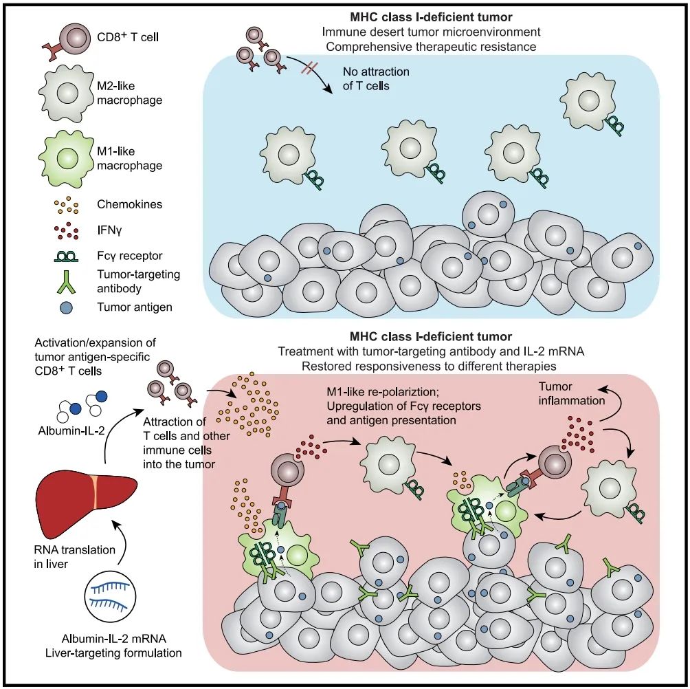 主要组织相容性复合体(MHC)I类抗原呈递缺陷是癌症免疫逃逸的常见机制,但对其机制和解决这一挑战的潜在策略仍然了解不足。通过β2-微球蛋白(B2M)缺陷的小鼠肿瘤模型,研究者发现MHC I类缺失导致肿瘤微环境(TME)的大量免疫荒漠化以及对免疫、化疗和放疗的广泛抵抗。该研究还展示了通过mRNA技术编码持久性IL-2进行治疗可以恢复免疫细胞浸润、IFNγ促进的高度炎症的TME特征,并且当与针对肿瘤的单克隆抗体(mAB)联合使用时,可以克服治疗抗性。意外的是,这种治疗的有效性是由释放IFNγ的CD8+ T细胞驱动的,这些细胞识别由TME中活化的巨噬细胞交叉呈递的新抗原。在IL-2治疗下,这些巨噬细胞获得了增强的抗原呈递能力和其他M1表型相关特征。该研究的发现强调了在治疗MHC I类缺陷癌症中恢复新抗原特异性免疫应答的重要性。