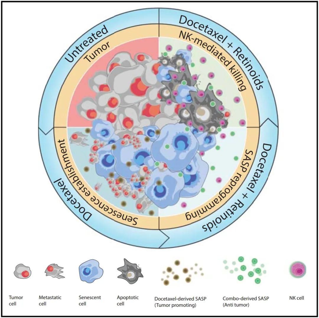 这篇文章的核心创新性在于发现维甲酸受体(RAR)激动剂阿达帕林在前列腺癌中作为有效的促进衰老化合物。研究表明,通过重新激活RAR,可以触发强烈的细胞衰老反应和具有抑制肿瘤特性的衰老相关分泌型表型(SASP)。在前列腺癌的临床前小鼠模型中,阿达帕林与多西他赛的组合能够促进一种抑制肿瘤的SASP,这种组合比任一单独药物更有效地增强了自然杀伤(NK)细胞介导的肿瘤清除。
