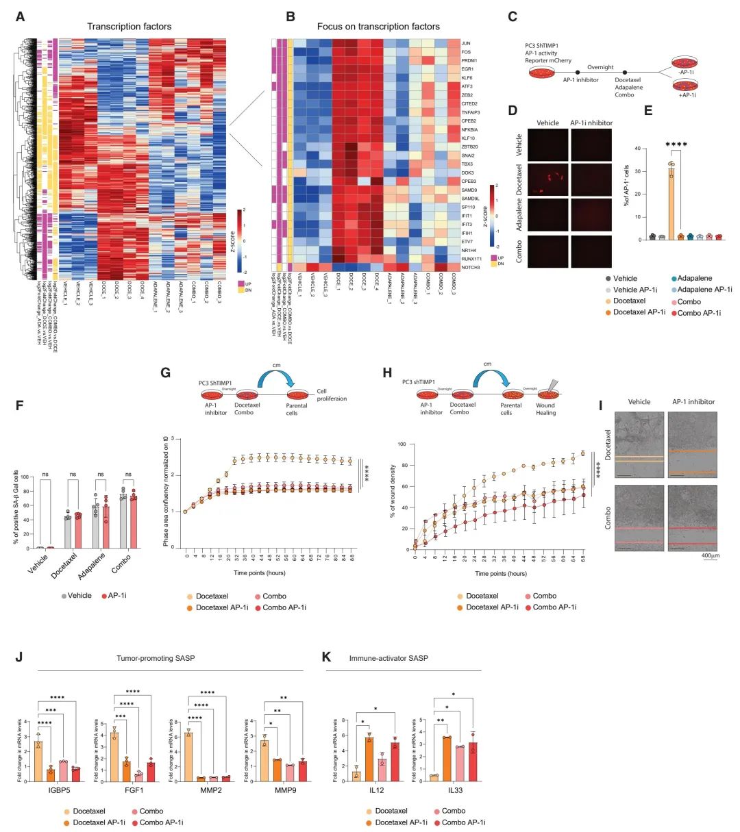 图 4. 阿达帕林通过AP-1重新编程由多西他赛引发的有害SASP