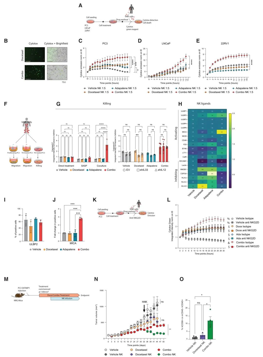 (B) 代表性图像显示与人NK细胞共培养的、预先用多西他赛和组合药物处理过的PC3细胞的细胞毒性发射(绿色)(刻度尺:400mm)。