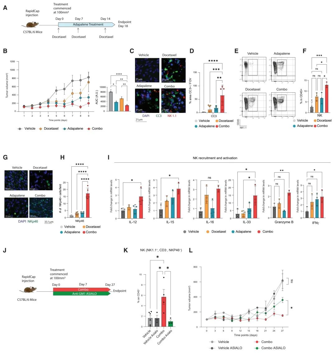 图 5. 阿达帕林联合多西他赛增强细胞衰老并激活抗肿瘤免疫反应