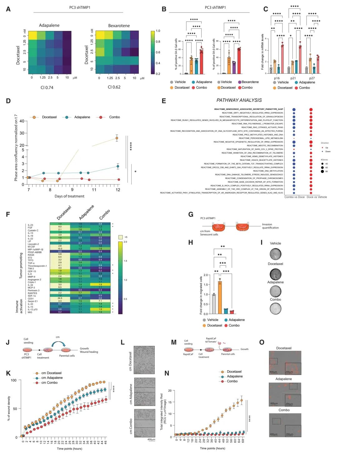 (C) 对用docetaxel、adapalene和组合药物治疗的PC3shTIMP1细胞进行衰老标志物的RT-qPCR分析。