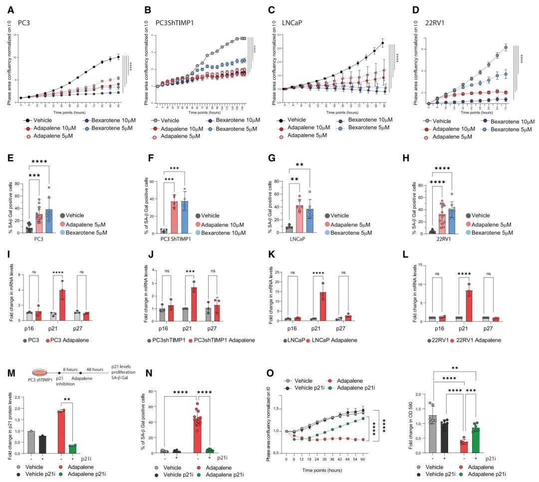 (N) 经p21抑制剂(p21i)UC2288和adapalene处理的PC3shTIMP1细胞中SA-β Gal的定量。