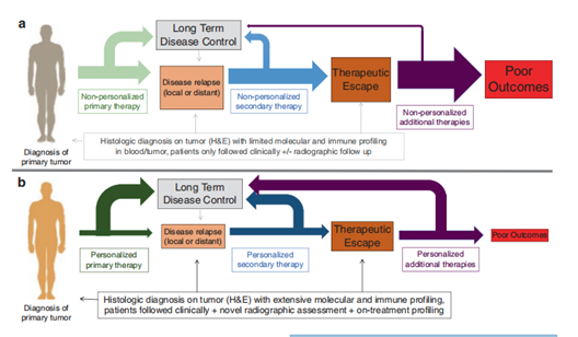 Fig 31.3 (A)动态和静态标记对免疫检查点抑制剂阻断的重要性。在传统的癌症治疗中,一旦诊断出原发肿瘤,通常会通过有限的分子分析和肿瘤组织以及可能的血液中的免疫图谱进行肿瘤评估。治疗通常是基于经验的非个性化方案,患者接受临床跟踪和可能的放射学随访。在这种情况下,相当大比例的患者会经历疾病复发,并接受非个性化的二次治疗——通常在最少或没有生物标志物评估的情况下进行。同样,反应的患者很少,大多数患者最终经历了治疗逃逸,总体结果较差。(B) 在癌症治疗的创新方法中,通过在治疗前进行广泛的分子和免疫图谱分析,来扩展原发肿瘤的组织学诊断。选择个性化的初级治疗方案是基于这些详细的见解,从而使更高比例的患者实现长期疾病控制。只有少部分患者发生疾病复发,此时,个性化的二次治疗方法被用来结合复发肿瘤的分子和免疫图谱以及肿瘤和血液的治疗响应图谱。较少的患者经历疾病逃逸,当这种情况确实发生时,基于更精细化的治疗策略,对个性化方法的响应更高。通过这种方法,治疗效果不佳的患者非常少见。