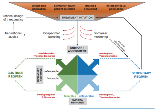 目前,由生物标记物驱动的临床试验设计正在逐渐被应用,例如TITAN-RCC肾癌试验(NCT02917772),这些试验将动态临床结果纳入后续治疗变更的决策中,并进行必要的组织和血液评估,以确定在每个治疗决策点的反应相关性。此外,例如BIONIKK肾细胞癌研究(NCT02960906),探索基于分子肿瘤信号预测免疫或靶向治疗反应的可能性,并据此进行初始治疗分配。FRATION-肺部试验(NCT02750514)在分配患者到初始治疗组时,考虑了先前的治疗历史和肿瘤的PD-L1表达,并采用适应性试验设计,使得非小细胞肺癌患者在病情进展时能转移到新的联合治疗组。