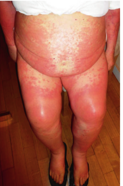 史蒂文斯-约翰逊综合征(Stevens-Johnson Syndrome)是一种较为罕见但潜在致命的疾病(Fig 33.3)。对于这种情况,建议立即采用静脉注射糖皮质激素治疗。如果症状没有改善,应考虑联合使用免疫抑制剂和皮质类固醇。