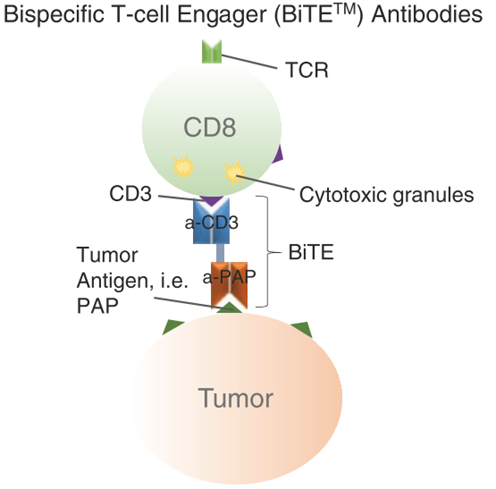 Fig 35.4 通过BiTE™抗体激活T细胞。BiTE™或DART™抗体通过结合T细胞表面的CD3分子,使T细胞被激活并对表达特定抗原(如PAP)的肿瘤细胞产生细胞毒性反应,而无需考虑T细胞的TCR特异性。BiTE™抗体由一个多肽链连接体组成,而DART™抗体则由两条多肽链和一个链间二硫键组成。