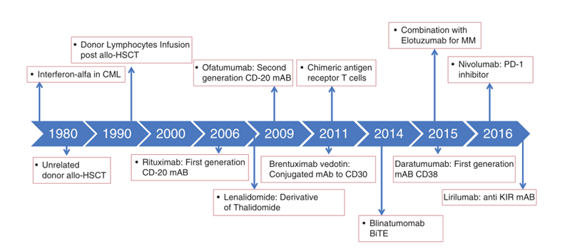 利用免疫系统来消灭恶性细胞一直是血液学家和肿瘤学家的长期追求。异体造血干细胞移植(HSCT)为这一梦想奠定了基础,这是首次在临床上成功验证免疫治疗在癌症中的潜力,尤其是在移植物对抗白血病的效果得到明确证明之后。尽管同种异体造血干细胞移植已成为常规治疗手段,但其主要局限性仍包括短期和长期的毒性、副作用,以及适合这种疗法的血液恶性肿瘤种类有限。此外,获取干细胞供体也存在一定困难。
