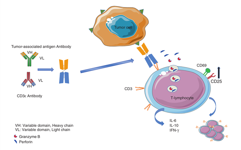 前面的章节中提到,单克隆抗体提供了一种比标准化疗更具选择性、且毒性更小的治疗方法。然而,单克隆抗体的一个主要缺点是,它们无法有效地将细胞毒性T淋巴细胞(CTL)招募到肿瘤区域,也无法将非炎症性肿瘤微环境转变为炎症性环境。