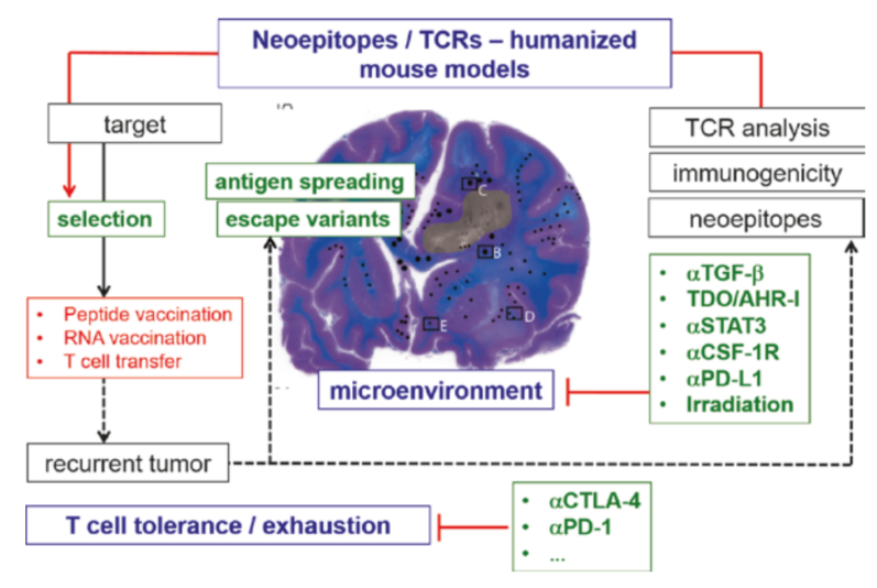 未来的临床试验应专注于精心筛选的患者群体,并由具有假设检验支持的转化程序推动,尤其是检查点抑制剂与辐射疗法、病毒治疗或特定疫苗的联合使用。这种转化方法要求在治疗后对肿瘤组织进行分析,以评估肿瘤内的免疫反应,但这在胶质瘤中是一个特殊挑战。为此,新辅助试验设计可以一定程度上规避其他肿瘤(如黑色素瘤或胃肠道癌症)中难以执行的活检-治疗-活检概念的困境。