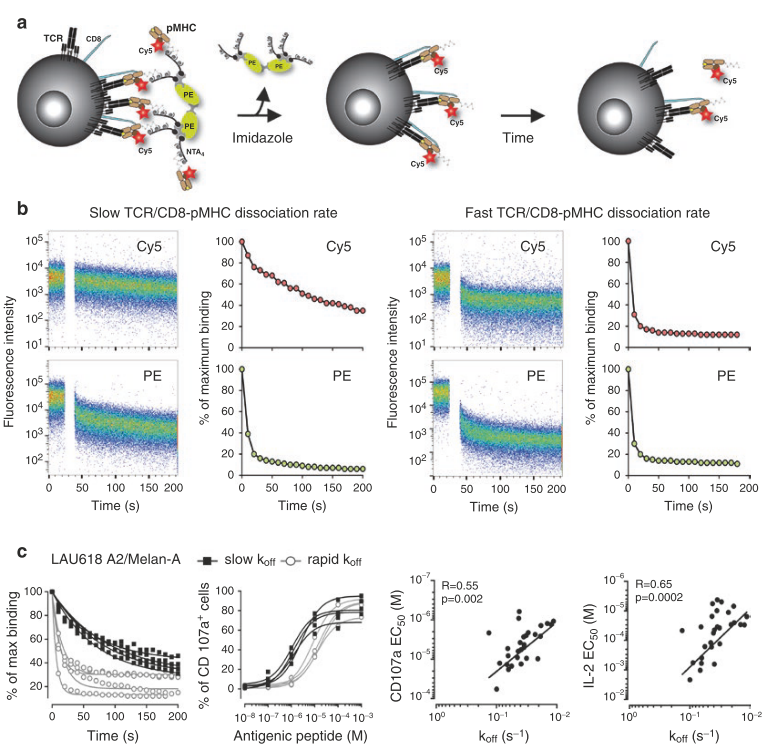 (a) 基于NTAmers的单体解离分析示意图。CD8 T细胞通过NTAmers进行稳定染色,NTAmers由链霉亲和素-PE(绿色)-NTA4(灰色)和含有Cy5标记的β2m(红色)的肽-MHC(棕色)单体组成。加入咪唑后,NTAmers迅速在Cy5标记的pMHC单体中解体(中间图)。根据固有的TCR/CD8-pMHC解离速率(koff)(右图),Cy5标记的pMHC单体随后从与细胞相关的TCR(黑色)和CD8(蓝色)解离。