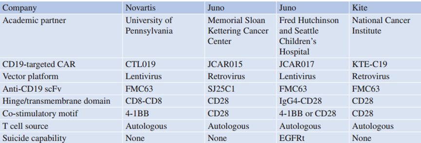 Table 42.3 临床最先进的CD19靶向CAR-T细胞方案选择