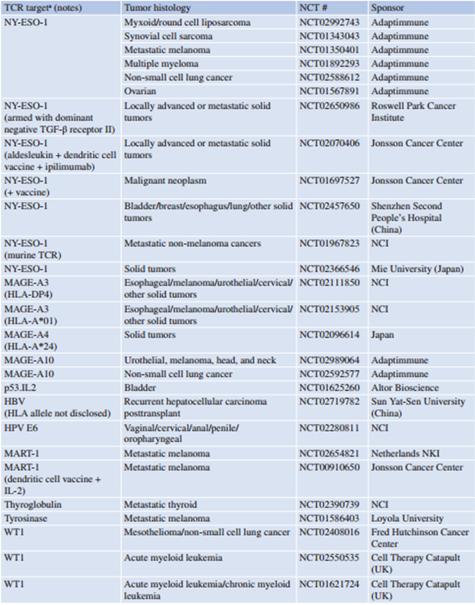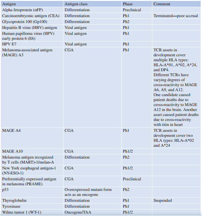 Table 42.1 列出了TCR T细胞在临床试验中的靶向抗原