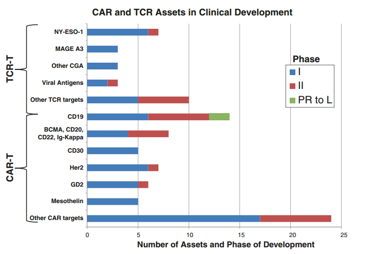 到目前为止,只有有限的研究探索了TCR T细胞技术,并显示出一致的临床活性。利用TCR工程外周T细胞靶向癌症抗原纽约食管鳞状细胞癌1(NY-ESO-1)的研究,产生了最为有前景的数据。因此,这类试验需要特别关注和进一步研究。