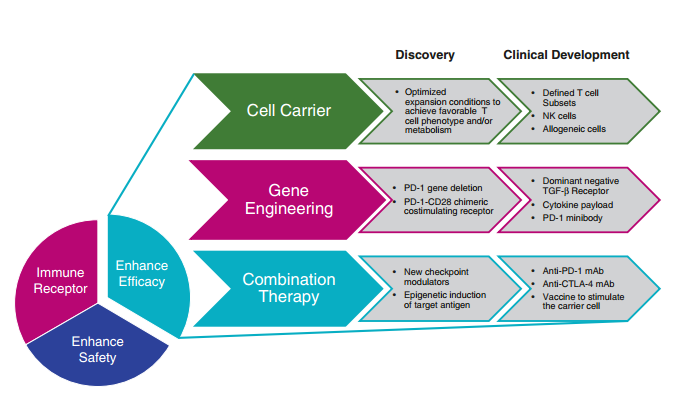 Fig.42.2 增强CAR-T细胞和TCR-T细胞疗法的疗效策略。通过三类途径增强疗效:提高细胞载体的质量或性质,增加基因工程步骤以“武装”治疗性T细胞对抗肿瘤微环境,或使用联合疗法。