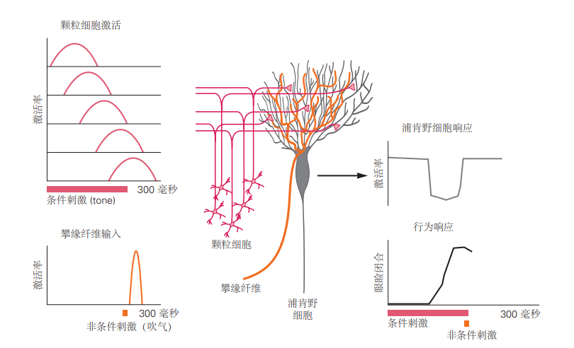 那么,浦肯野细胞放电的减少是如何导致习得性运动反应的呢?浦肯野细胞通常具有自发活动,它们通过抑制其下游靶点来发挥作用。小脑区域的浦肯野细胞接收到与眼部有害刺激相关的攀爬纤维输入,并与控制眼睑闭合的神经元形成突触连接。因此,习得的浦肯野细胞放电暂停恰好在适当时刻触发眼睑闭合,以保护眼睛。适当的暂停时间被认为是由颗粒细胞多样的时间反应模式所介导的。计算机仿真表明,如果单个颗粒细胞在条件刺激后的不同延迟处活跃,或展示出与条件刺激相关的不同但可重复的时间模式,那么通过颗粒-浦肯野细胞突触可塑性,可以解释正确定时响应的学习过程。