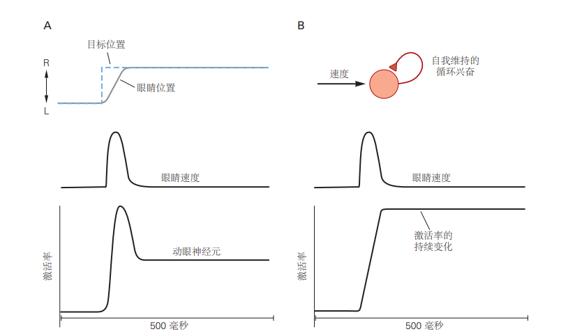 动眼神经系统中整合回路的存在最初源于来自神经元记录的一个令人费解的观察结果(见图5.2.4A)。控制眼部肌肉动眼神经元不仅通过瞬时增加动作电位放电引发眼睛的运动,还会在眼睛保持在固定位置时,表现出持续的动作电位放电。例如,当眼睛注视保持在左侧时,投射到眼球肌肉的运动神经元的放电频率高,而当注视保持在右侧时,放电频率较低。然而,投射到动眼神经元的运动前神经元只在眼球运动前短暂放电,没有表现出与眼睛位置相关的持续活动。那么,持续的活动是如何产生的呢?