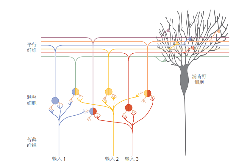 图 5.2.3:小脑接收来自大脑和脊髓多个区域的输入。这些输入统称为苔藓纤维,在大量颗粒细胞中进行重新编码。这个过程是发散连接的一个例子,它允许输入信号的多种可能组合浦肯野细胞的树突接收来自数十万个颗粒细胞会聚输入,这些细胞通过其轴突(称为平行纤维)中继信号。浦肯野细胞突触的平行纤维具有可塑性,这被认为是运动学习以及可能的其他学习形式的重要机制。